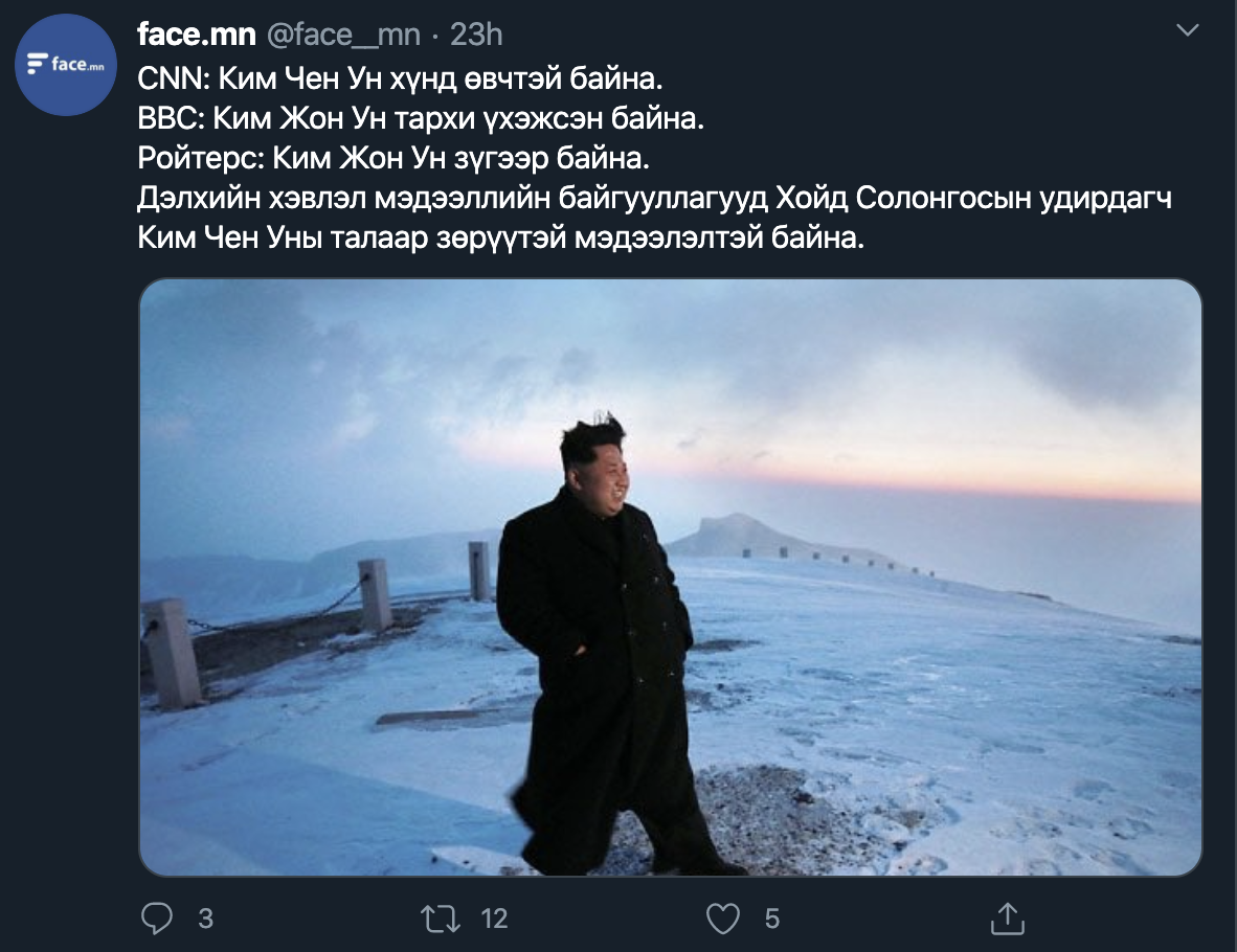 @face__mn: CNN: Ким Чен Ун хүнд өвчтэй байна. BBC: Ким Жон Ун тархи үхэжсэн байна. Ройтерс: Ким Жон Ун зүгээр байна. Дэлхийн хэвлэл мэдээллийн байгууллагууд Хойд Солонгосын удирдагч Ким Чен Уны талаар зөрүүтэй мэдээлэлтэй байна.