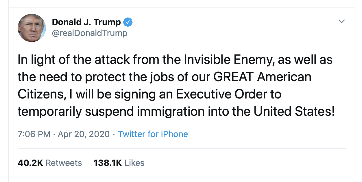 “Үл Үзэгдэгч дайсны дайралтад ороод байгаа энэ үед, АГУУ Америкийн ард түмний ажлын байрыг мөн хамгаалахын тулд, би зарлиг гарган Америкт ирэх цагаачлал түр хугацаагаар зогсоох болно!”